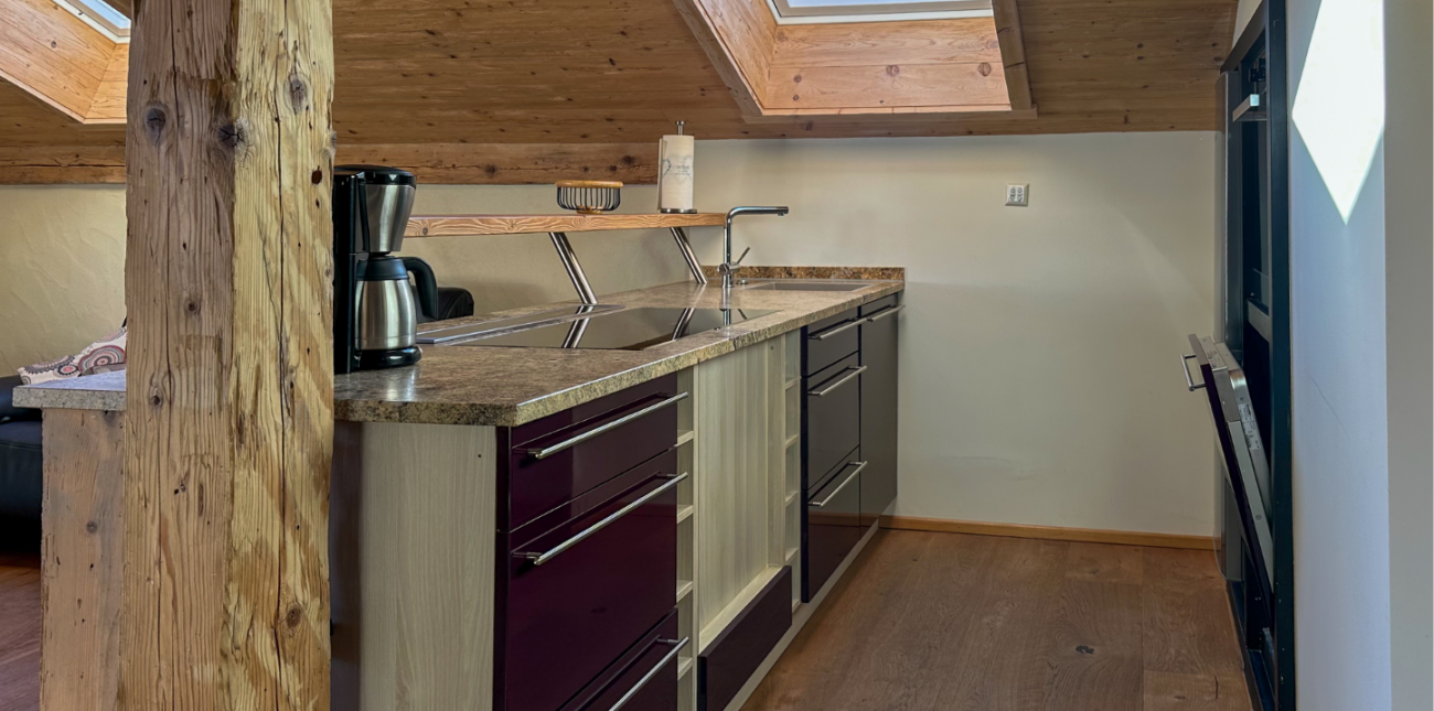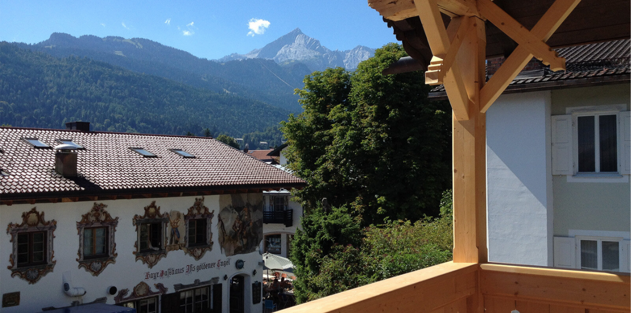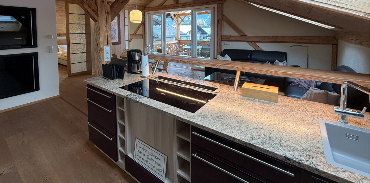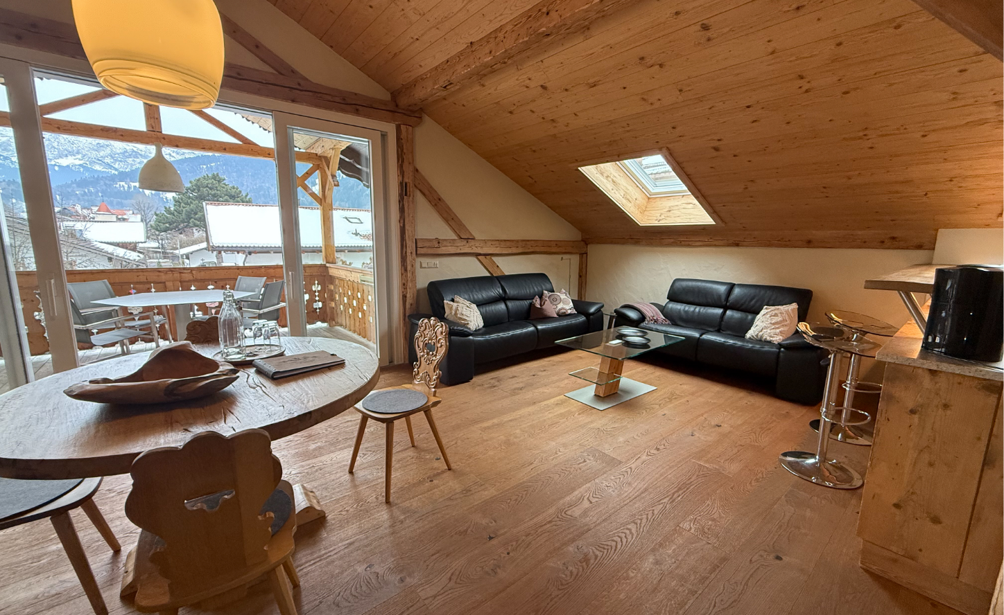 Von dem neuen großen überdachten Balkon hat man einen grandiosen unverbauten Bergblick. Eine moderne Beleuchtung, ein hochwertiger Tisch, neue Leichtmetallstühle lassen Sie die Sommerabende besonders genießen.