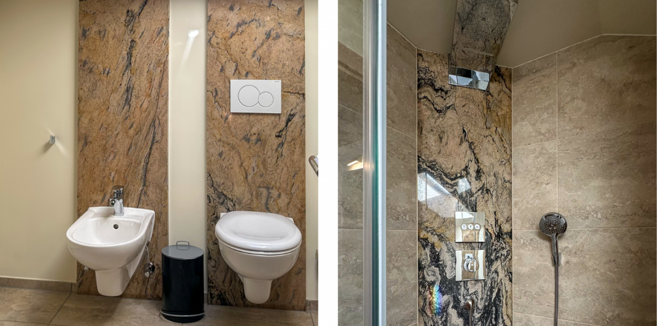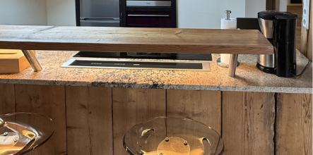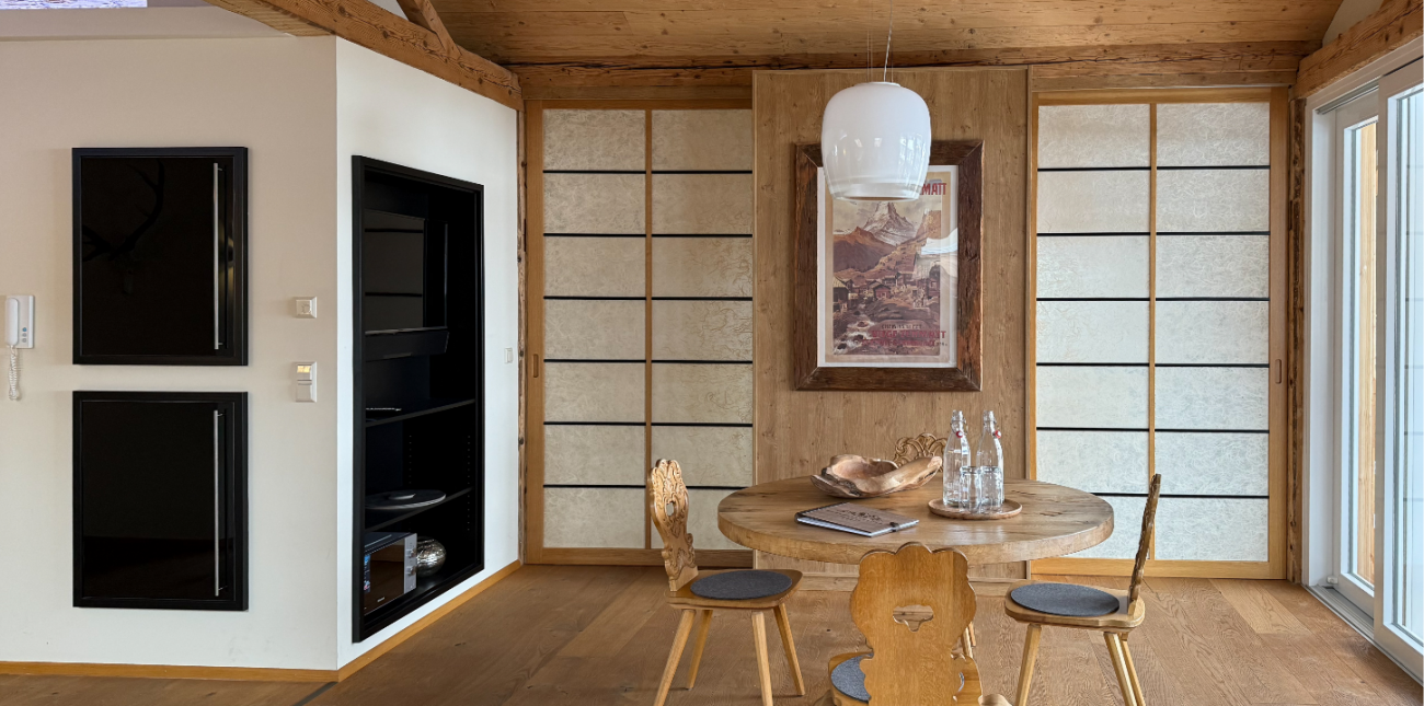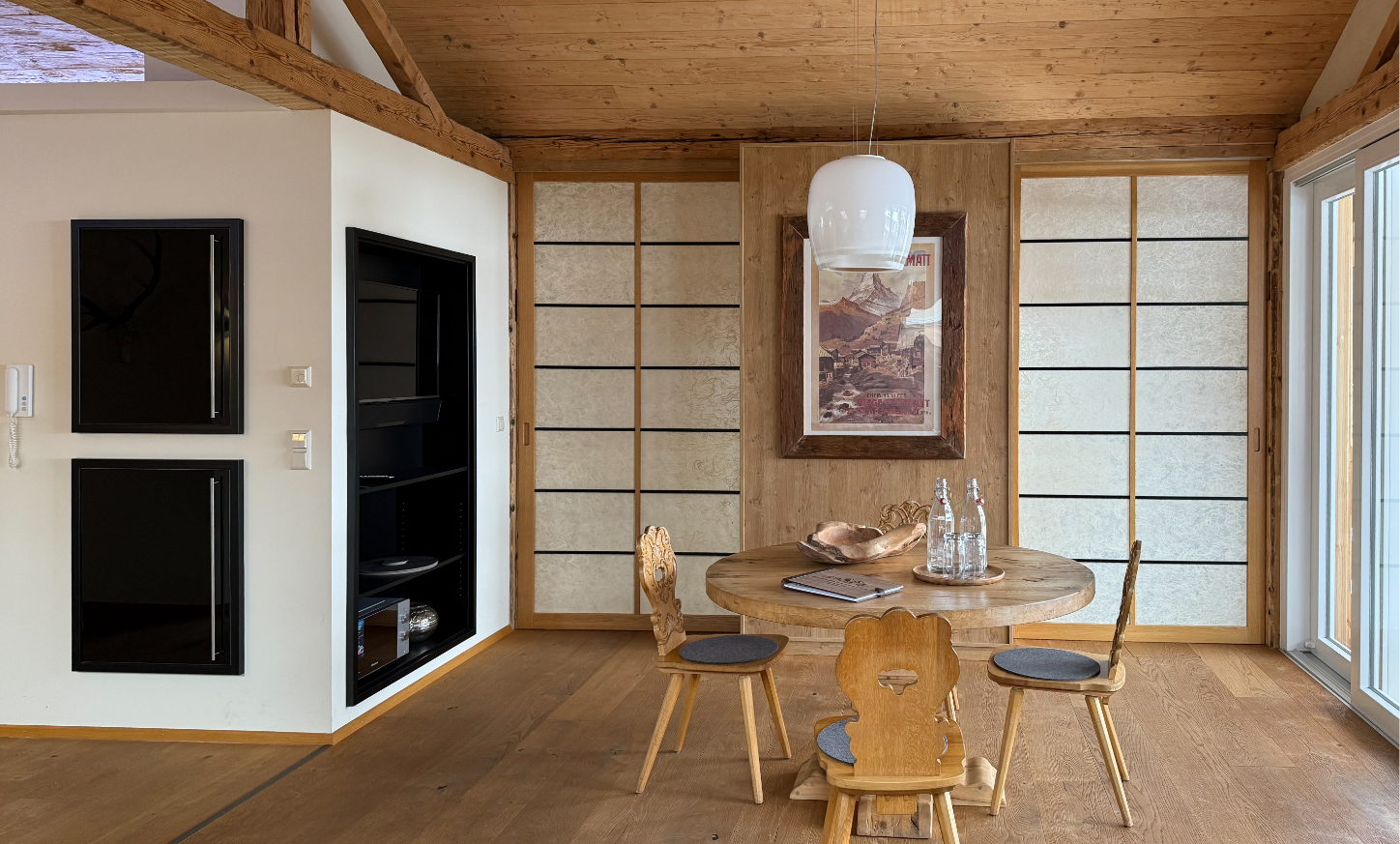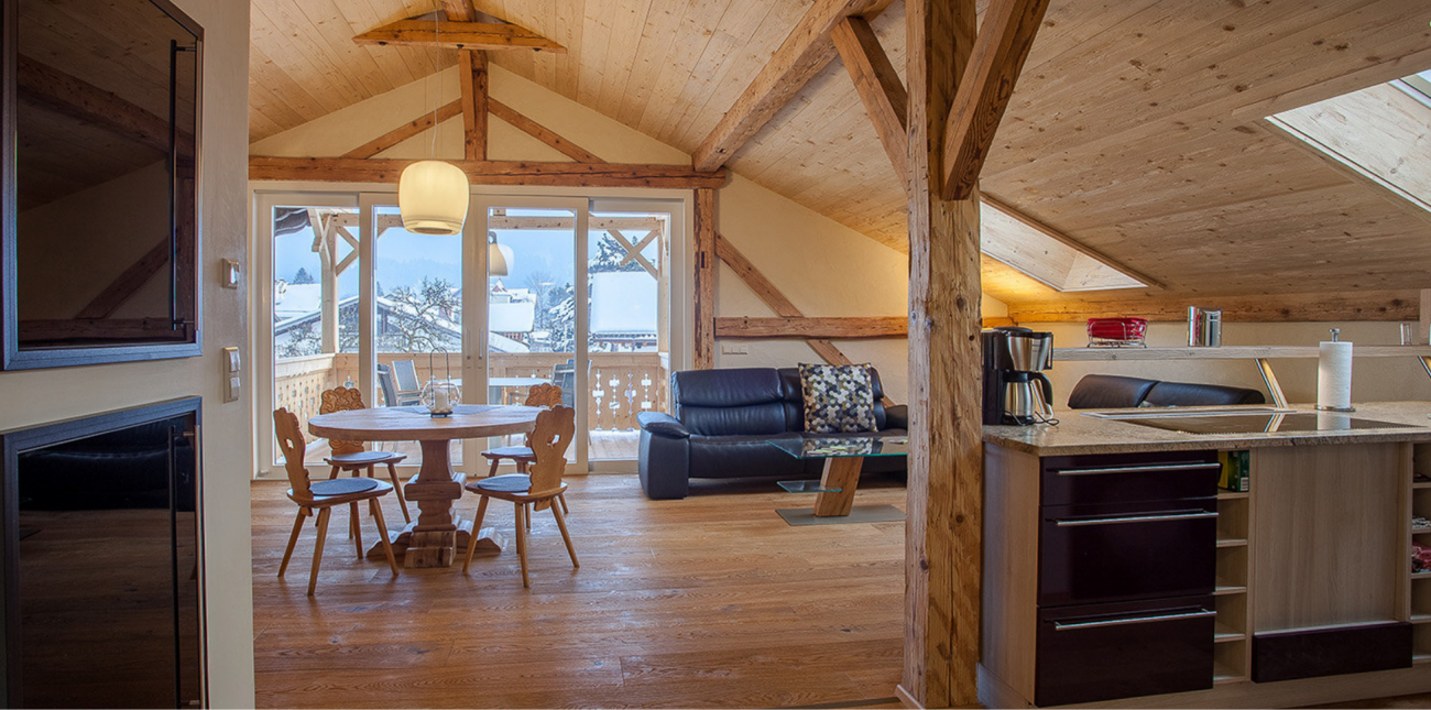 Von dem neuen großen überdachten Balkon hat man einen grandiosen unverbauten Bergblick. Eine moderne Beleuchtung, ein hochwertiger Tisch, neue Leichtmetallstühle lassen Sie die Sommerabende besonders genießen.
